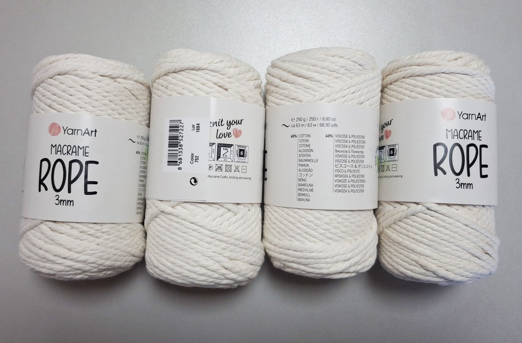 Makrame vrvica YarnArt Macrame Rope 3 mm je kakovostna, dvojno sukana preja, narejena iz številnih bombažnih niti. Surovinska sestava 60 % bombaža ter 40 % viskoze in poliestra zagotavlja popolno ravnovesje med mehkobo, trdnostjo in prožnostjo.