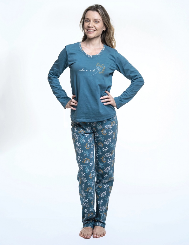 Ta udobna in elegantna dvodelna pižama združuje preprostost in ženstvenost. Zgornji del v enobarvnem modrem odtenku je okrašen z nežnim potiskom regrata in napisom "make a wish" , ovratnik pa ima diskreten cvetlični detajl, ki se popolnoma ujema z vzorcem spodnjega dela.