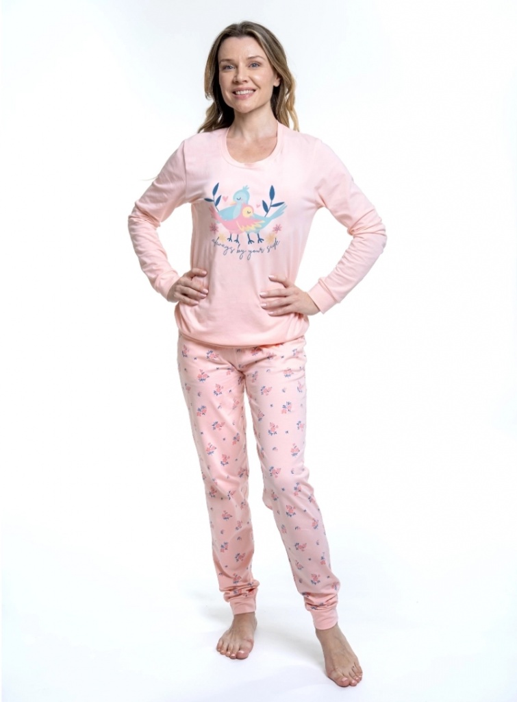 Ta mehka in udobna dvodelna pižama je kot nalašč za dober spanec in sproščene trenutke doma. Zgornji del v pastelno roza odtenku je okrašen z ljubkim potiskom dveh ptic z napisom "Vedno ob tebi" , spodnji del pa ima nežen cvetlični vzorec, ki se popolnoma prilega.